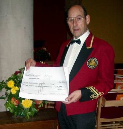 Roger Clements - Band Chairman holding the cheque for £1,677 in favour of St Christopher's Hospice.