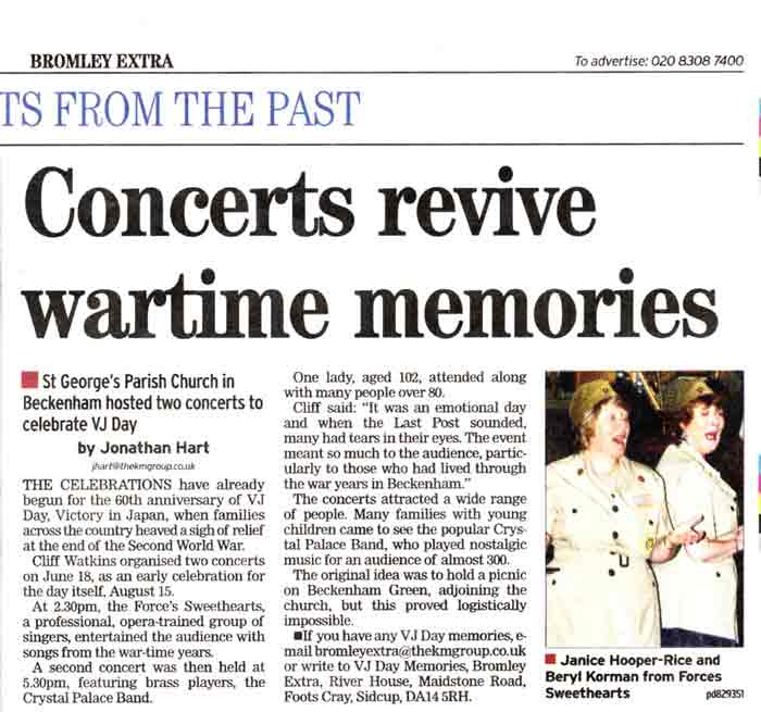'Home Front Recall' concert at Beckenham (newspaper review) and a concert at the 'Norton Flower Festival in the beautiful Kent countryside. Many thanks to Paul Newman, a past secretary of the band, for sponsoring this concert. We also played at Chris and Glenda's wedding on the 2nd July. Chris Atkins has been a member of the band, on and off, for many years past. We wish Chris and Glenda every hapiness for the future.